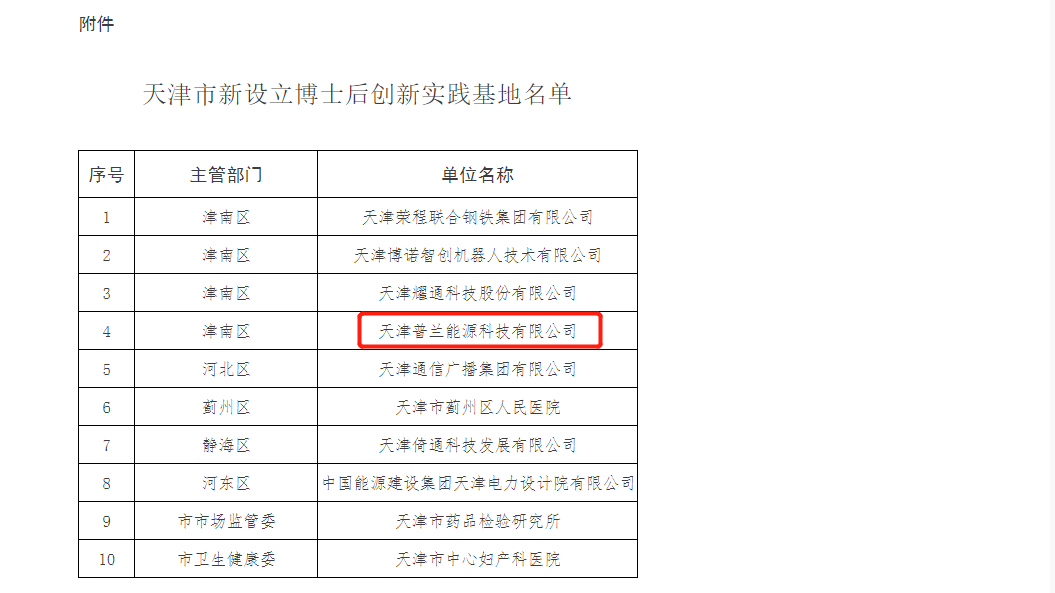 普兰的成功入选标志着我司在研发和创新领域的实力得到了深度认可,同时在高层次人才培养和研发平台等方面的建设仍任重而道远。今后我司将继续坚持人才引进政策、优化人才培养机制,以需求为导向、以项目为载体积极开展产学研合作,努力实现科技创新水平再创新高、切实提高“筑巢引凤”能力,为区域创新发展和产业升级贡献自己的力量。为贯彻落实中央及市委人才工作会议精神,深入实施“海河英才”行动计划,优化博士后培养平台布局,进一步发挥博士后人才对我市高质量发展的支撑作用,经单位申报、主管部门推荐、专家评审,新设立10家天津市博士后创新实践基地,我司成功入选。