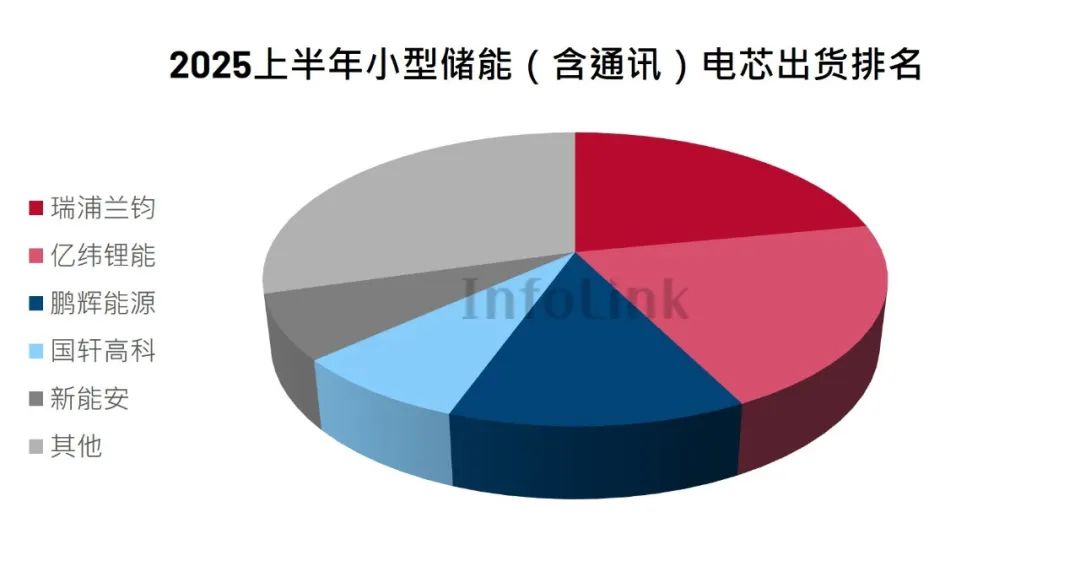 2025 上半年度,全球小储电芯出货 21.64 GWh,同比增长 72.38%。二季度单季度小储电芯出货量超过 10 GWh,创下近三年单季度交付记录,主要由于下游终端补库以及澳洲市场出货潮。小储市场方面,瑞浦兰钧自本榜单统计以来首次登顶。当前,小储领域竞争依旧激烈,市场或正迈入“Big 3”格局。得益于较早布局赛道并在头部客户中具备较高覆盖率,瑞浦兰钧、亿纬锂能和鹏辉能源的市占率已显着领先于其他厂商。