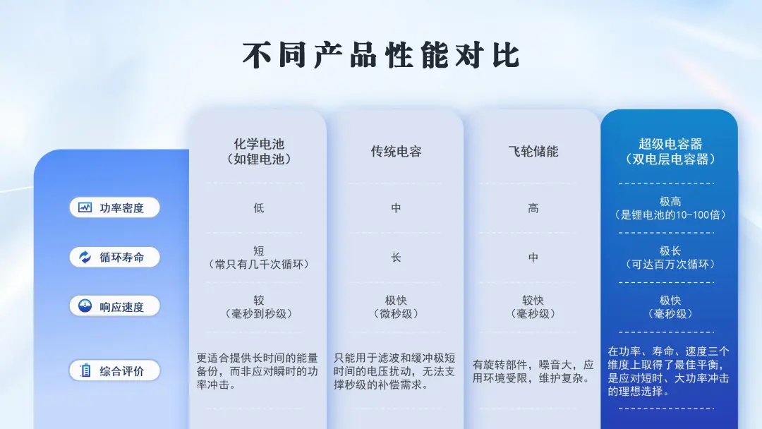 要应对持续仅几百毫秒到数秒的电压暂降,理想的储能技术必须在功率密度(爆发力)、循环寿命(耐久性)和响应速度(反应力)这三个关键维度上取得完美平衡。