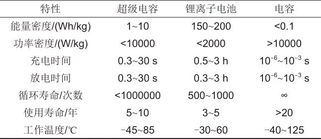 超级电容作为一种新型储能器件,与其他常见储能器件的能量密度、功率密度、充放电时间和循环寿命等参数的对比如表1所示。和其他储能器件相比,超级电容在具有良好能量密度的同时,同样具有功率密度高、循环寿命长以及工作温度范围广等优点,因此,基于超级电容的储能系统在电力系统调频领域有着独特的优势。因其具有较高的功率密度,超级电容能够在电网发生波动时快速吸收或释放功率,从而满足电力系统调频对瞬时功率波动的补偿需求。其次,超级电容具有极快的充放电速度,可以实现毫秒级到秒级的充放电,从而能够实现对电力系统的调频指令做到快速响应。此外,超级电容的高循环寿命和宽工作温度范围使其能够适应极端气候地区的电网调频。综上所述,超级电容的特性使其非常适合用于电力系统的快速调频,并能够有效应对新能源并网带来的频率波动问题,进而提高电网的稳定性和可靠性。