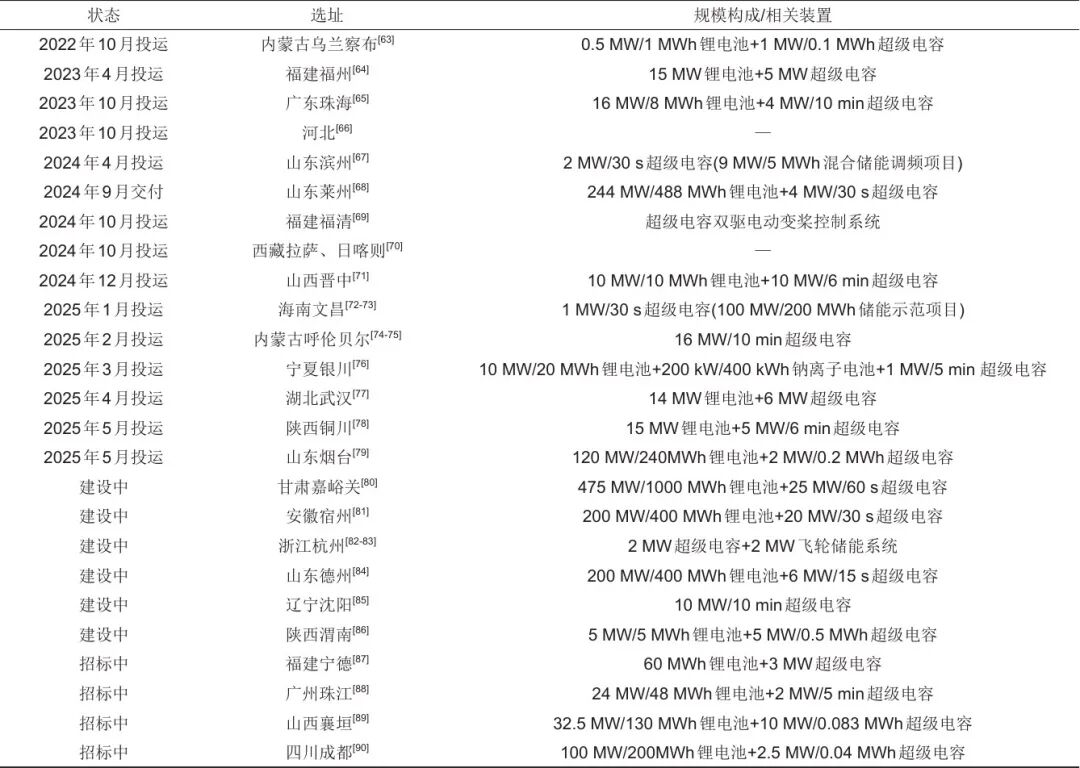 考虑合适的控制策略与容量配置方法,超级电容已逐渐成为电力系统调频的关键技术。具体来说,通过考虑超级电容与电源、负荷的互动,将超级电容集成到原有电力系统中,不仅可以平衡能源之间的间歇性,还可以提供即时的能量支撑,增强电力系统的可靠性。目前,超级电容辅助电力系统调频已有大量工程案例,其中,已投运、建设中以及投标中的部分典型工程案例见表3。