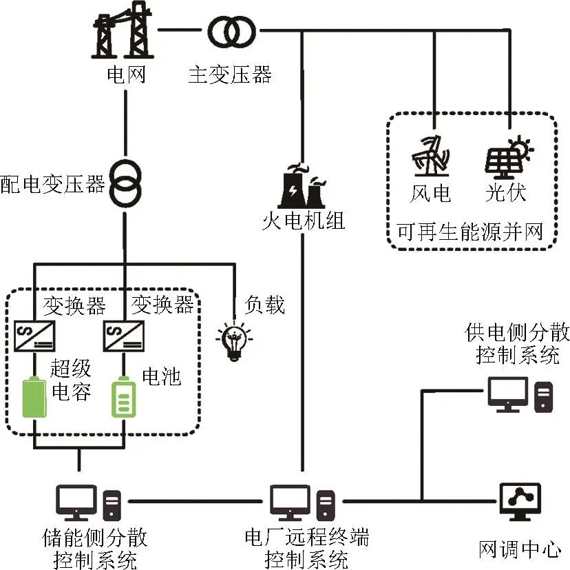 除作为独立单元应用于储能调频系统外,超级电容更常以混合储能系统中的核心组件形式存在,其典型应用模式为与锂电池构成混合储能调频系统。此类系统能够快速充放电并精准调节输出功率,调频效果远好于常规发电机组。其系统结构如图1所示,电源侧整合火电与可再生能源形成互补发电体系;储能侧通过混合储能调频系统经变换器实现能量双向流动;控制系统涵盖电厂远端、储能就地控制及网调中心三级管理模块,实现“源、网、荷、储”协调控制,体现出混合储能调频系统在新型电力系统中的协同调频机制。